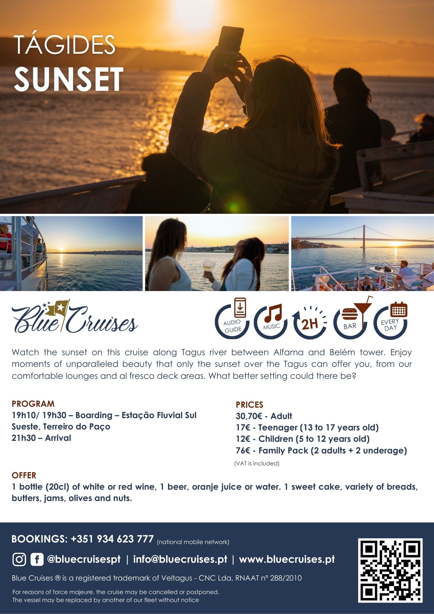 Watch the sunset on this cruise along the Tagus between Alfama and the Belém Tower. Enjoy moments of unrivalled beauty that only the sunset over the Tagus can offer you, on a spacious and comfortable ship. What better setting could there be?
