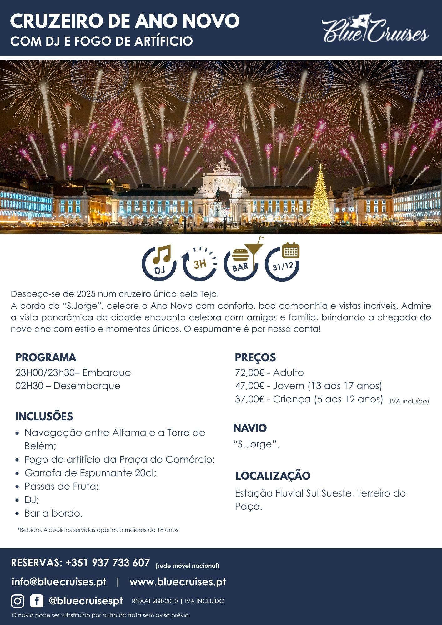 À bord du « navire S. Jorge », célébrez le Nouvel An dans le confort, en bonne compagnie et avec une vue incroyable. Admirez la vue panoramique sur la ville tout en faisant la fête avec vos amis et votre famille, en trinquant à l'arrivée de la nouvelle année avec style et en vivant des moments uniques. Le vin mousseux est offert !