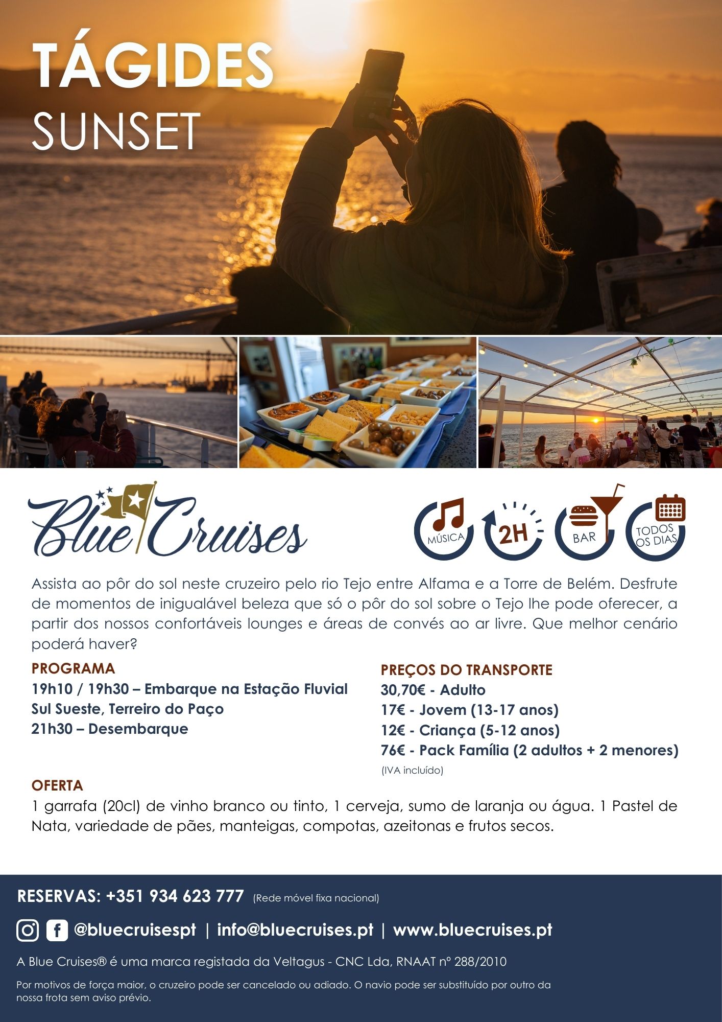Assista ao pôr do sol neste cruzeiro pelo rio Tejo entre Alfama e a Torre de Belém. Desfrute de momentos de inigualável beleza que só o pôr do sol sobre o Tejo lhe pode oferecer, a partir dos nossos confortáveis lounges e áreas de convés ao ar livre. Que melhor cenário poderá haver?